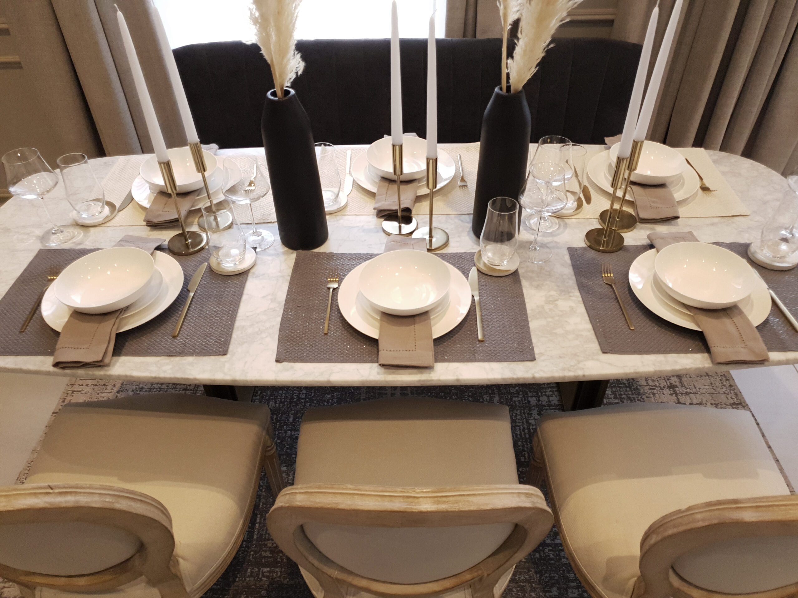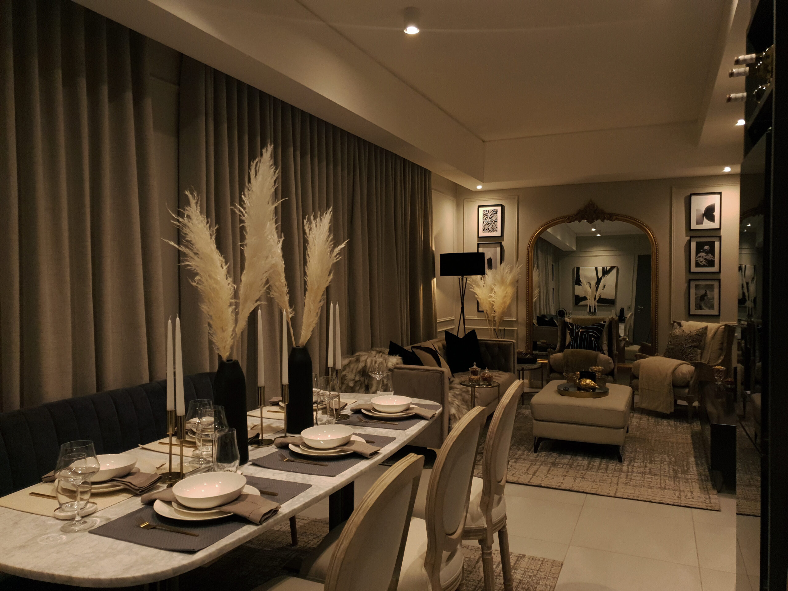 The apartment features a monochrome, beige, and taupe colour palette with black and gold elements that create a striking contrast. The open-plan dining and lounge areas are seamlessly integrated, and the use of repeating design elements ties the two spaces together.