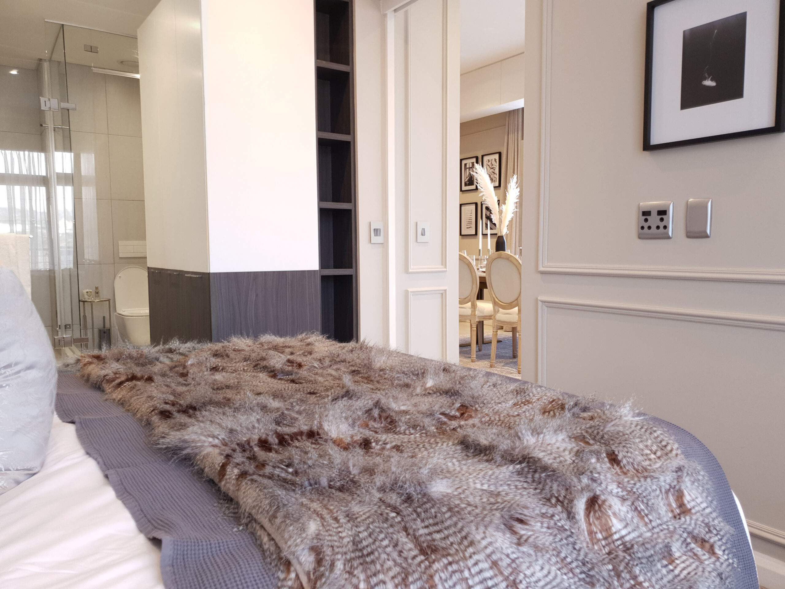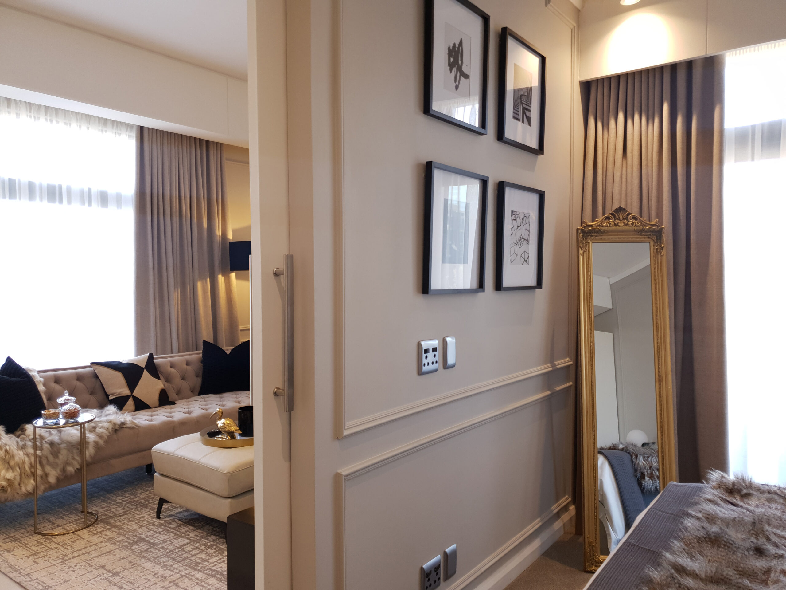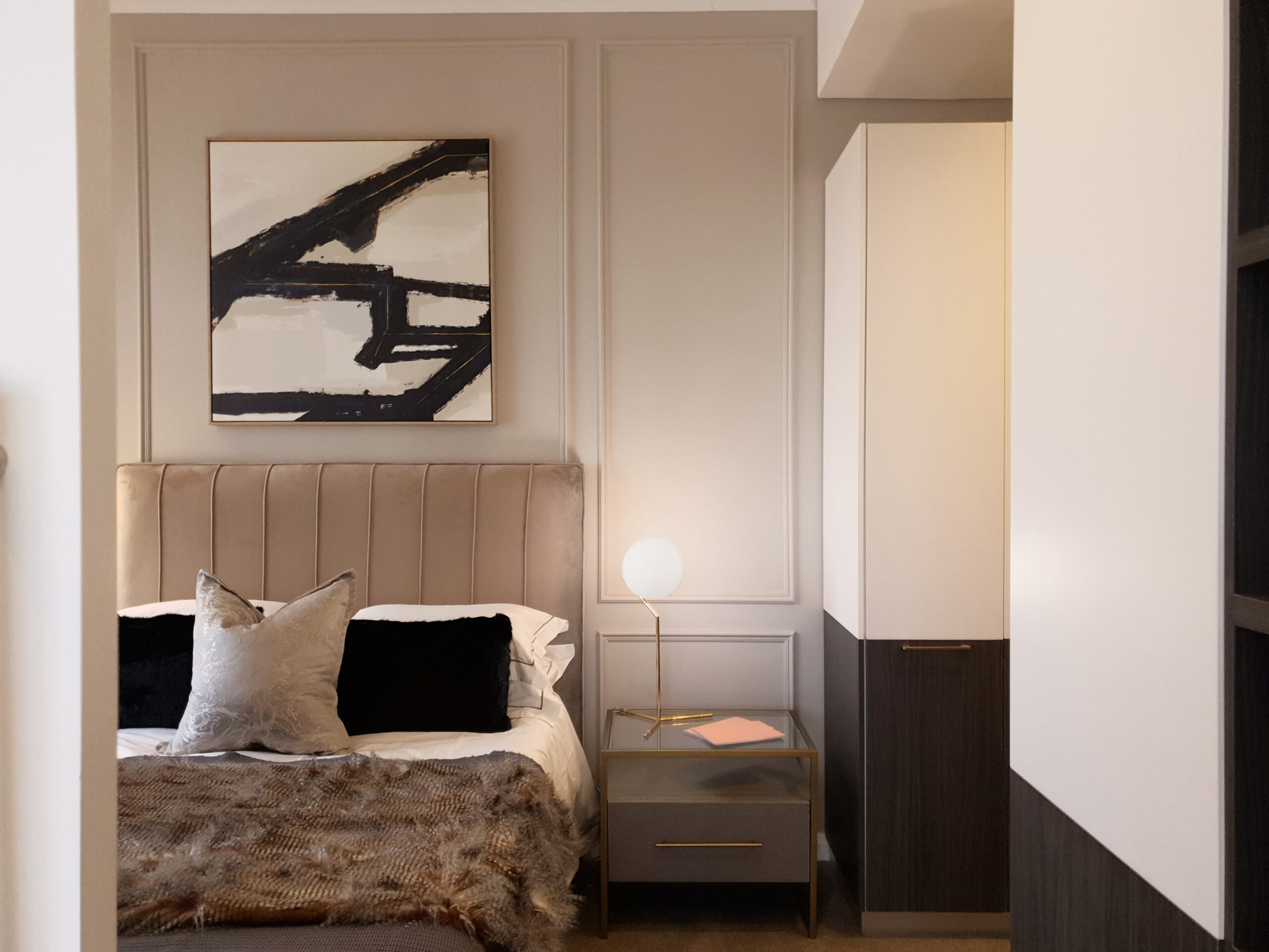 In the bedroom, contemporary furnishings sit against a more classical-style panelled wall, while art and mirrors create a cohesive aesthetic throughout the apartment. Overall, Regal @ Maine is a sophisticated and luxurious space that provides international business travellers with a comfortable and stylish home away from home.