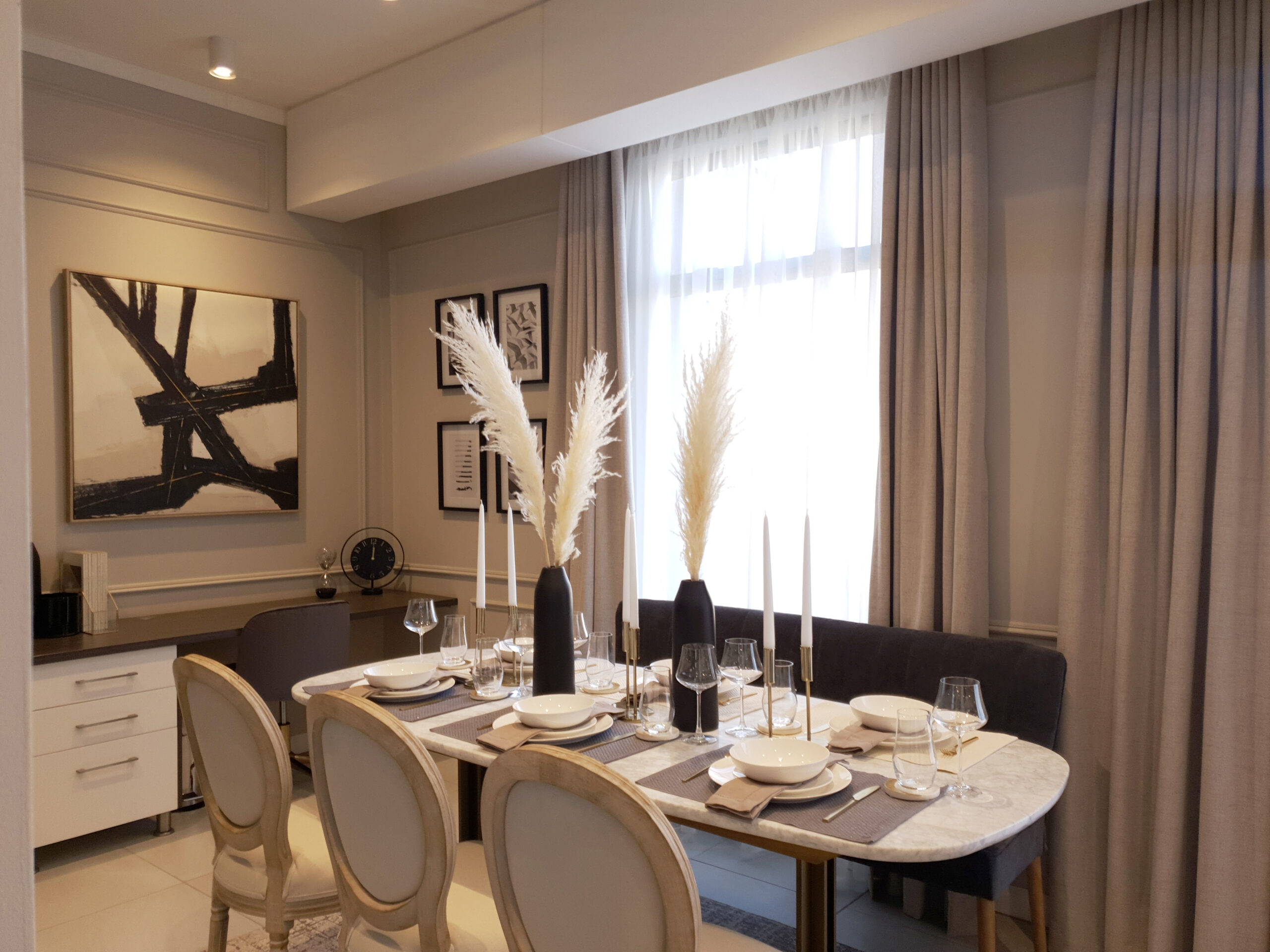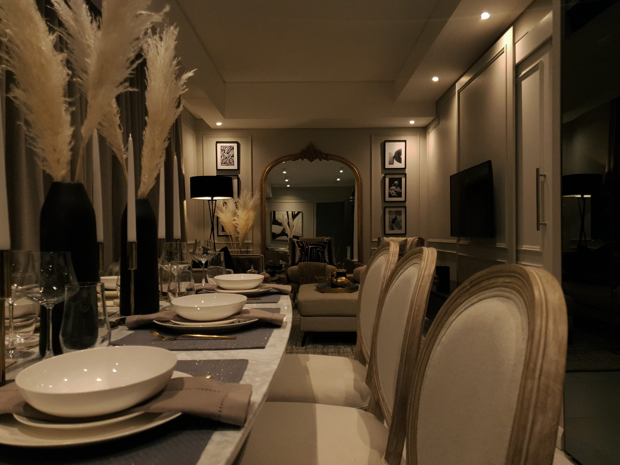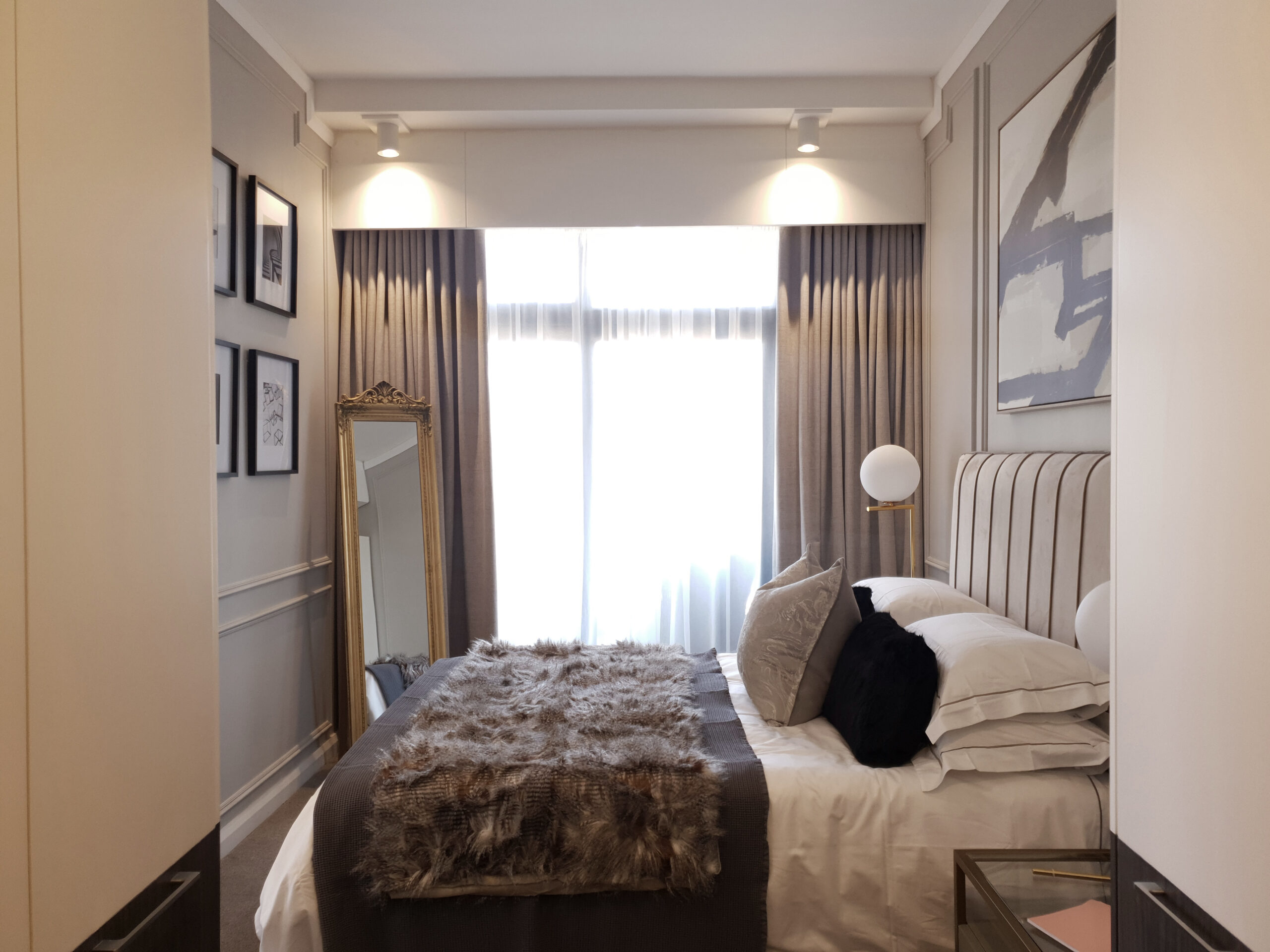 In the bedroom, contemporary furnishings sit against a more classical-style panelled wall, while art and mirrors create a cohesive aesthetic throughout the apartment. Overall, Regal @ Maine is a sophisticated and luxurious space that provides international business travellers with a comfortable and stylish home away from home.