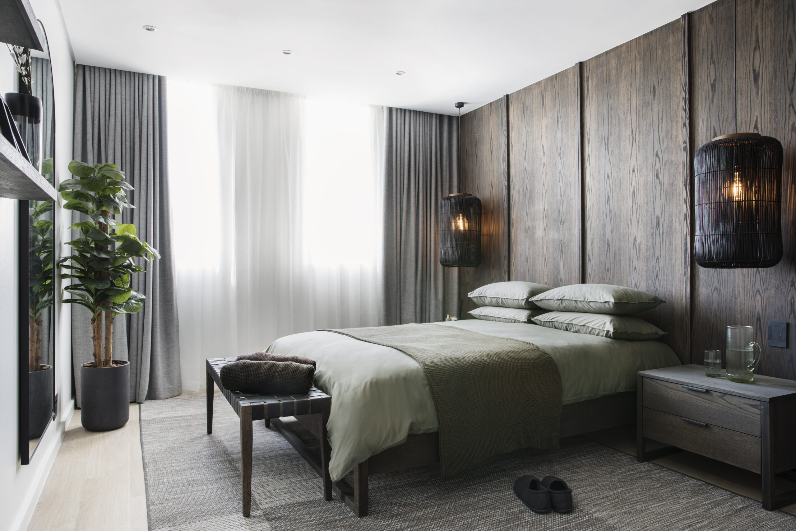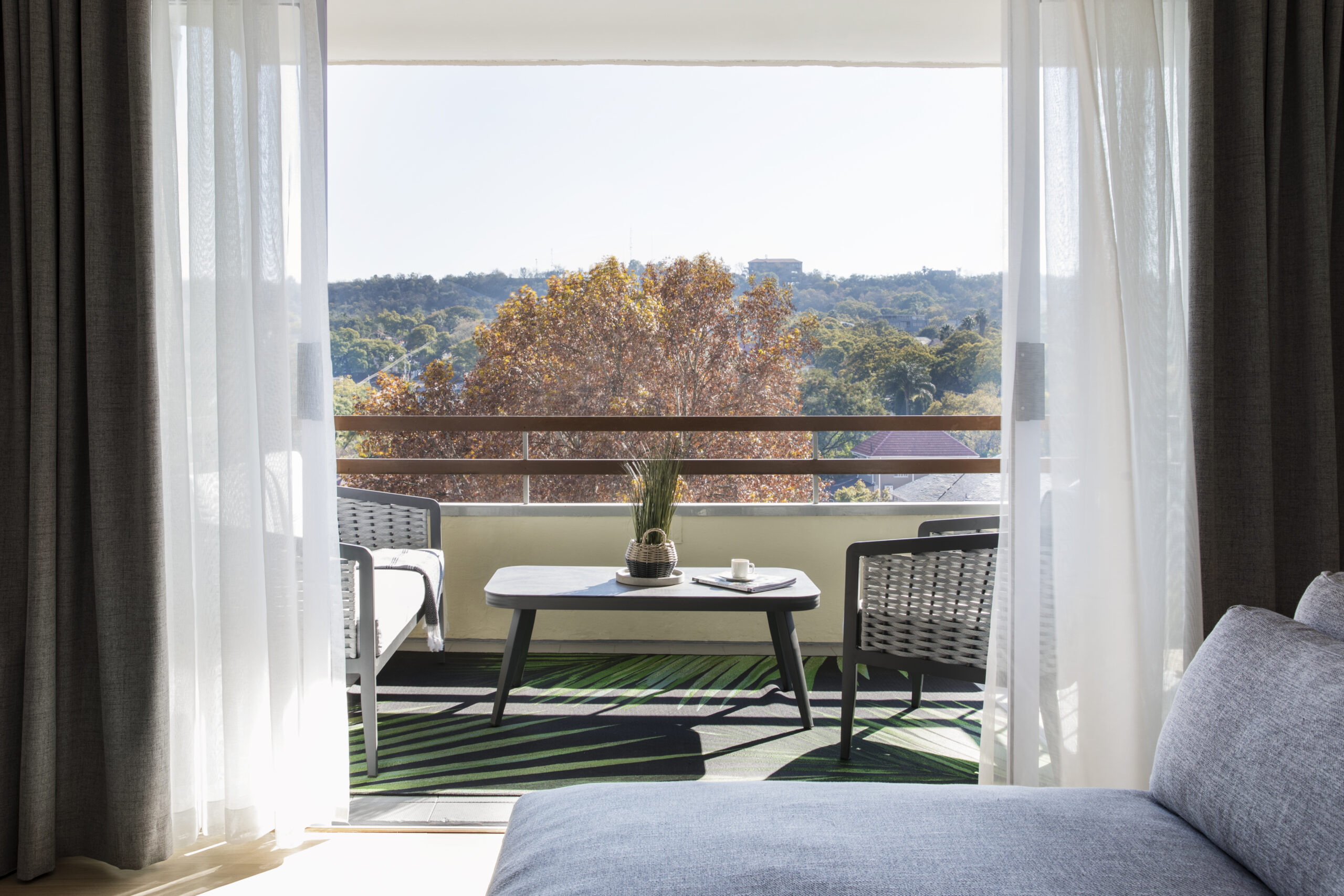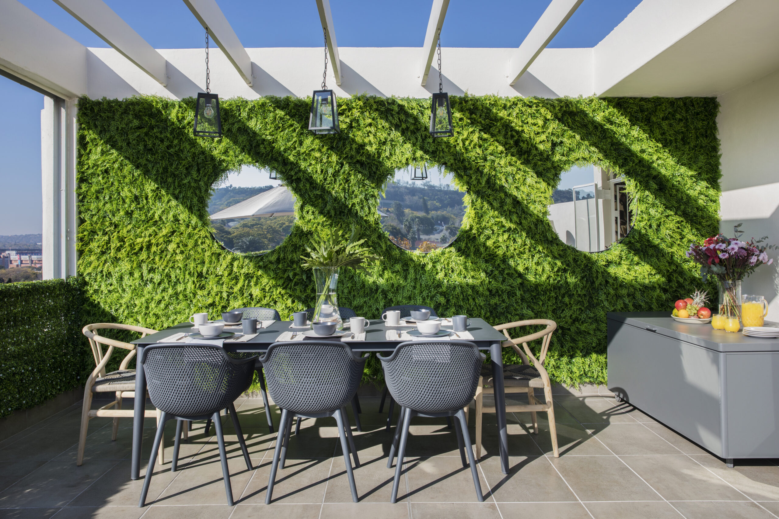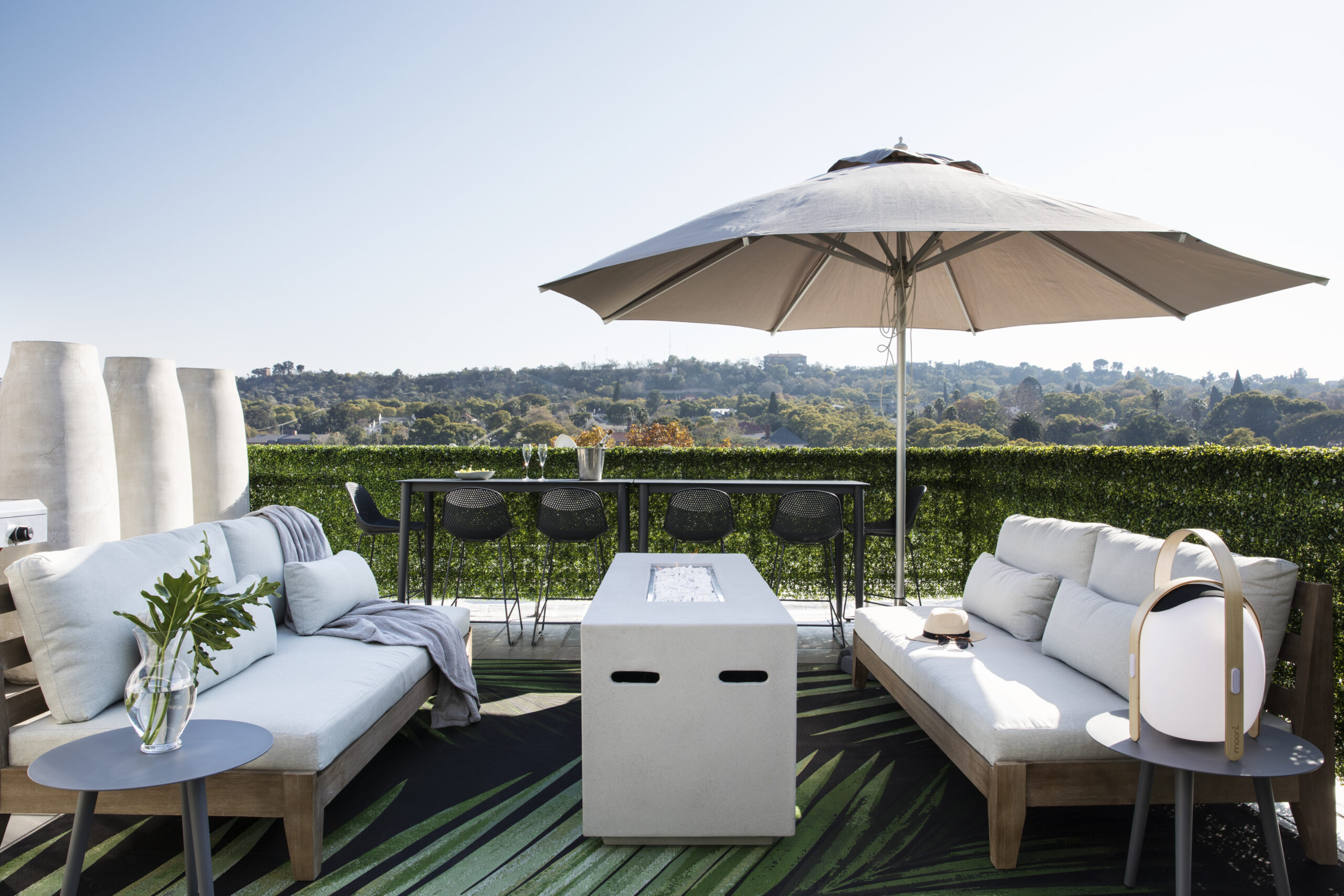 The main bedroom features darker tones and green accents, creating a natural and calming atmosphere, while the rest of the apartment has a soft colour palette and timber-panelled walls, with mismatched lights and artwork adding interest and character. The newly added third bedroom has a patio with stunning views of the Union Buildings, designed with white bedding and light tones. The rooftop veranda is a beautiful space to relax, with a bar overlooking the iconic skyline, an outdoor lounge with a fire pit, and a dining area with a green wall.
