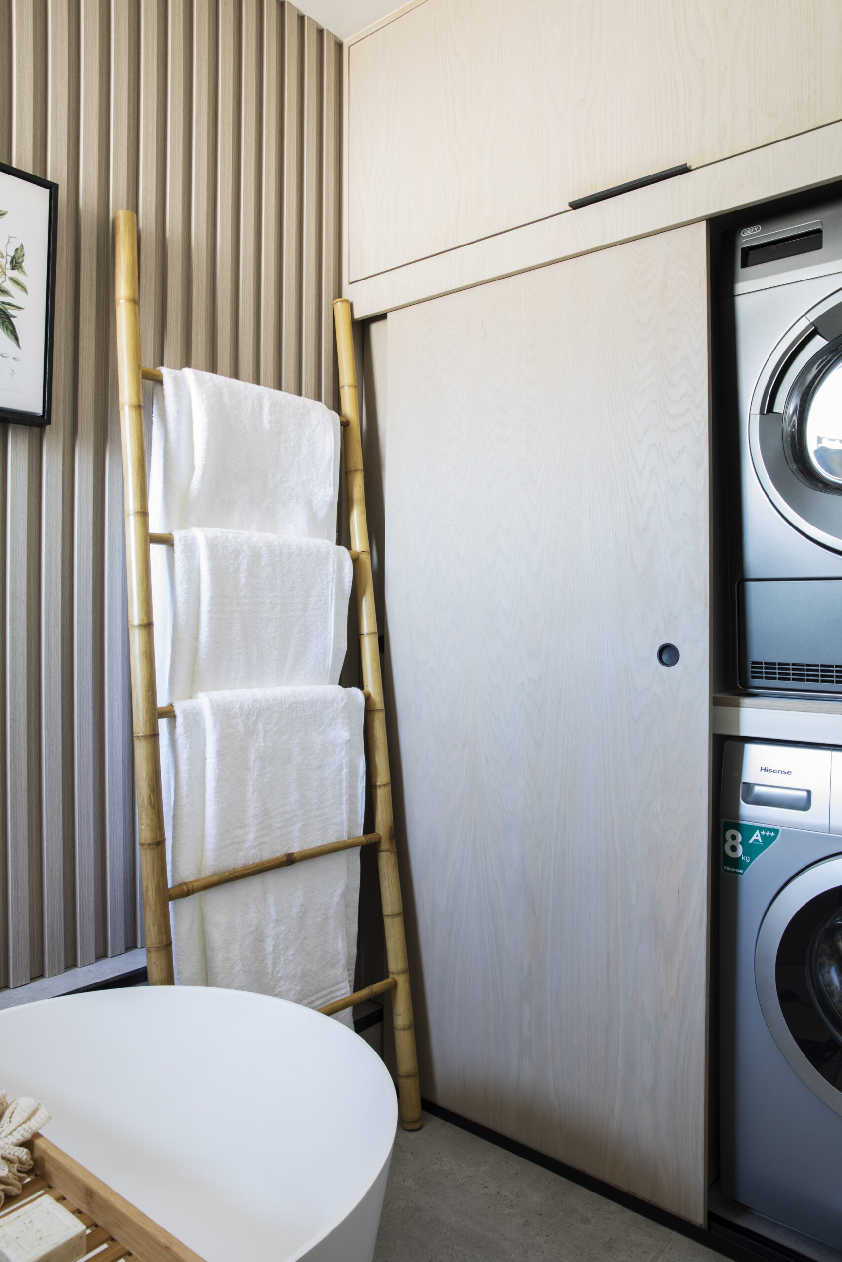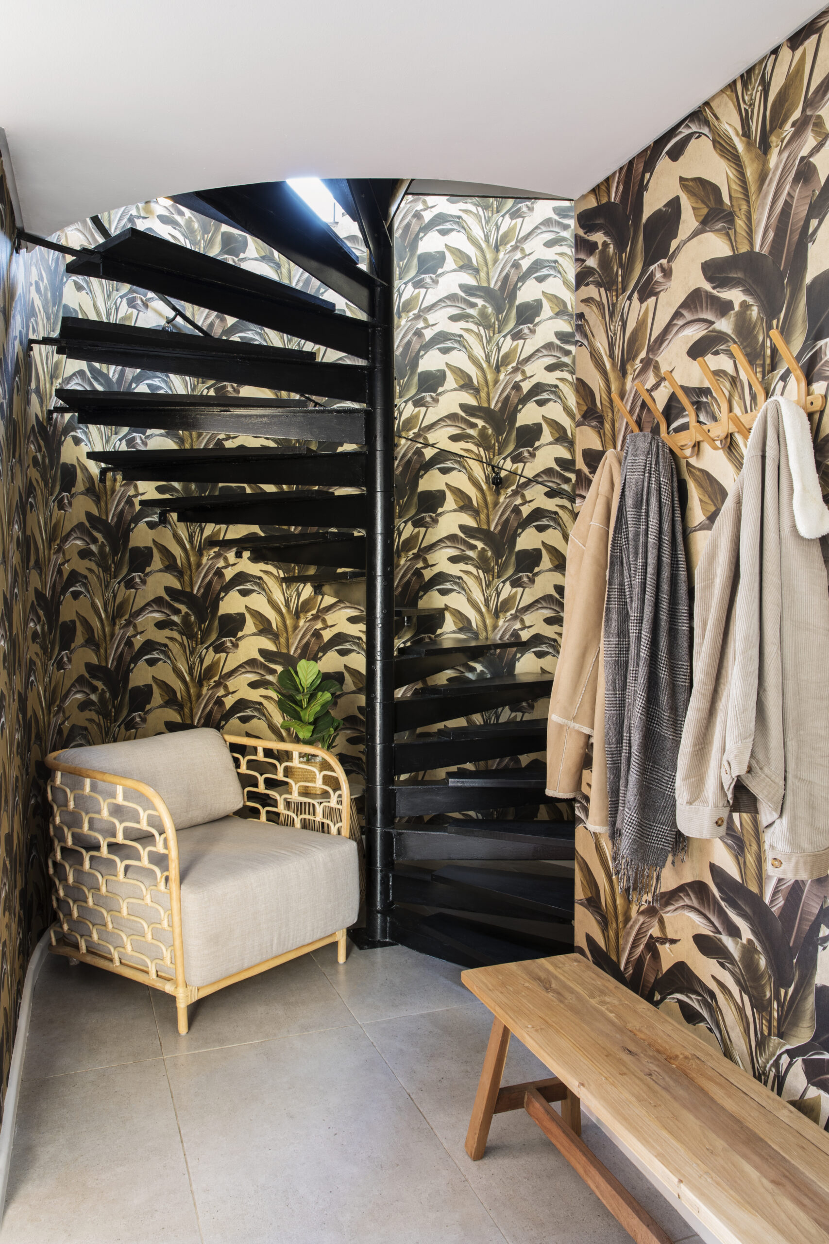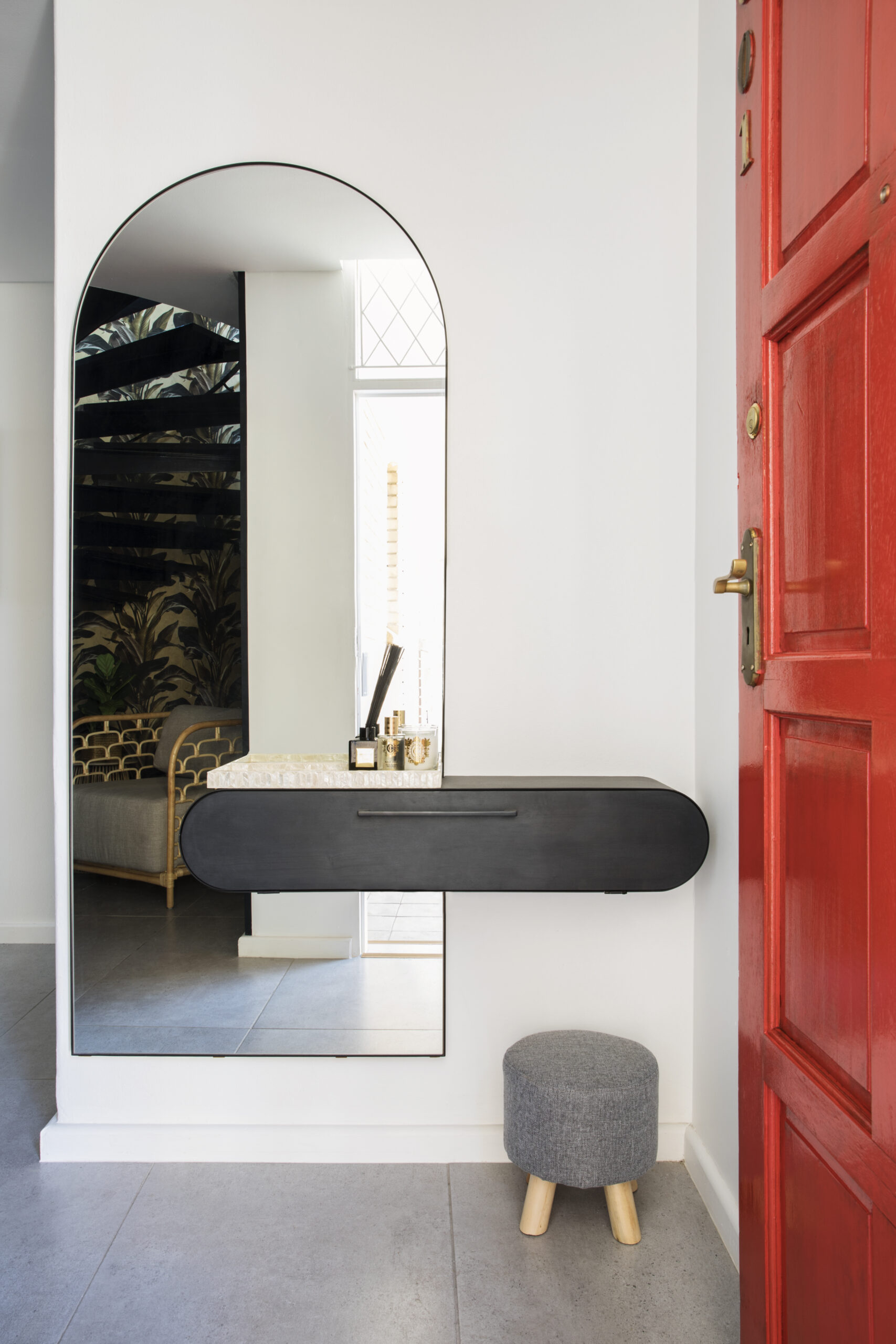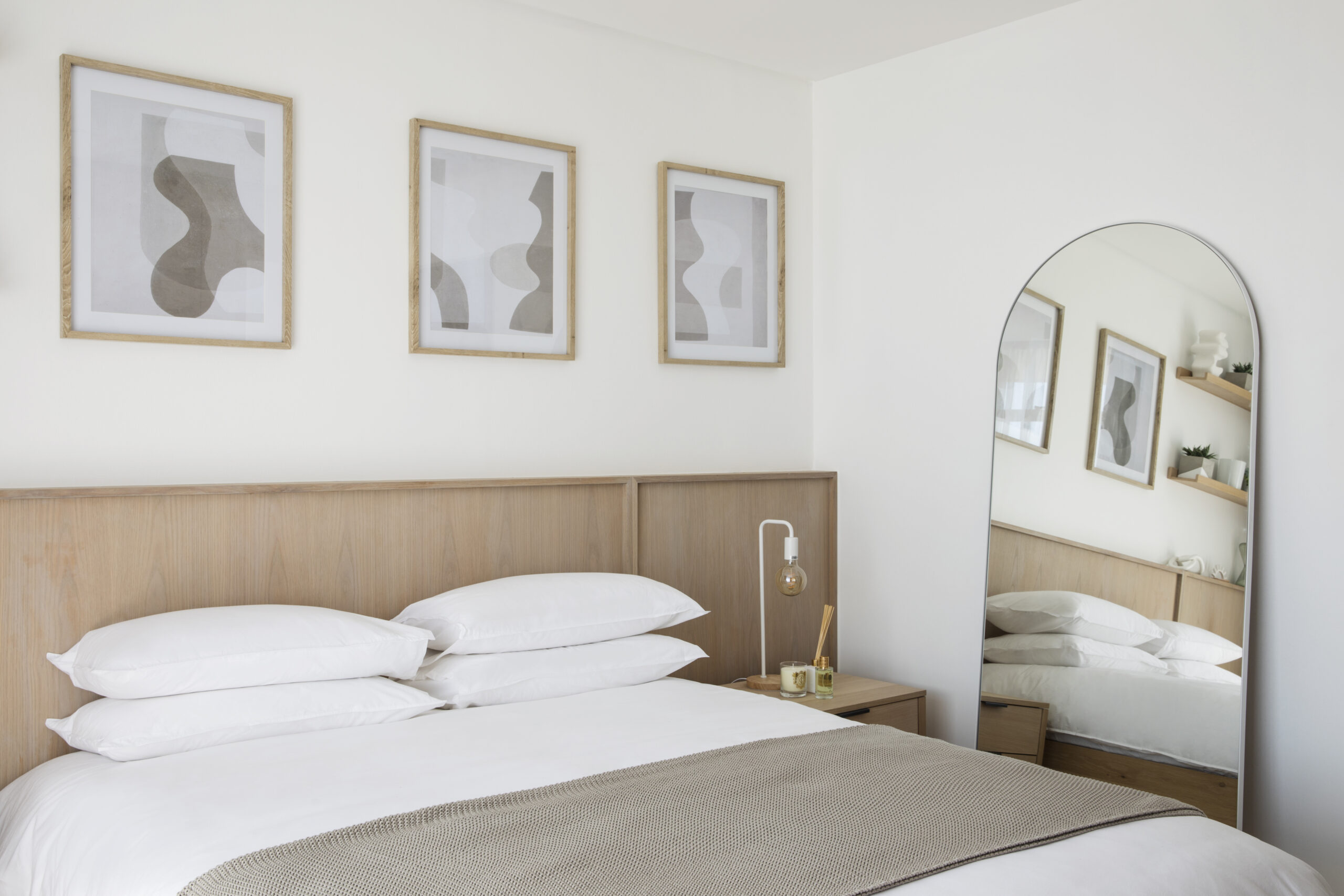 The main bedroom features darker tones and green accents, creating a natural and calming atmosphere, while the rest of the apartment has a soft colour palette and timber-panelled walls, with mismatched lights and artwork adding interest and character. The newly added third bedroom has a patio with stunning views of the Union Buildings, designed with white bedding and light tones. The rooftop veranda is a beautiful space to relax, with a bar overlooking the iconic skyline, an outdoor lounge with a fire pit, and a dining area with a green wall.